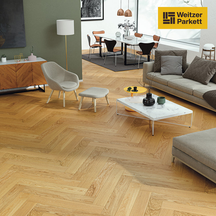Jetzt in Aktion: Fischgrät Weitzer Stab 750 Eiche ruhig, gefast, gebürstet